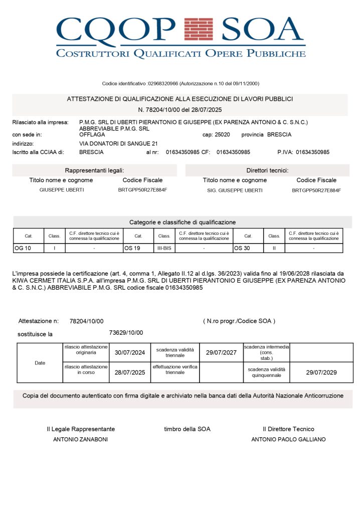 Nel medesimo anno ha conseguito L’’ATTESTAZIONE DI QUALIFICAZIONE ALLA ESECUZIONE DI LAVORI PUBBLICI ( S.O.A. )